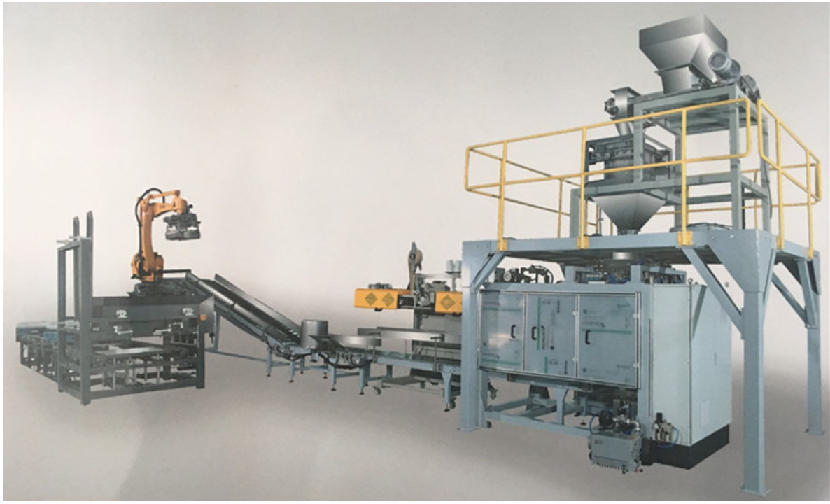 स्वचालित खाली बैग देना - स्वचालित वजन - स्वचालित भरना - स्वचालित सिलाई मशीन - स्वचालित संदेश - स्वचालित रोबोट पैलेटाइजिंग स्टैकिंग;
